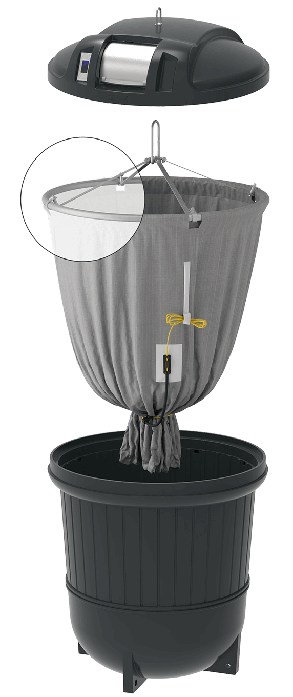The lower end of the bag is closed with a rope mechanism. When emptying above the collection vehicle, a mechanism is deactivated by pulling the rope and the bag opens. After emptying, the bag is pulled closed and the mechanism reactivates. With an above-ground height of 900 mm, there is no risk of falling into the container. In addition, the system is protected from the penetration of groundwater and rainwater.